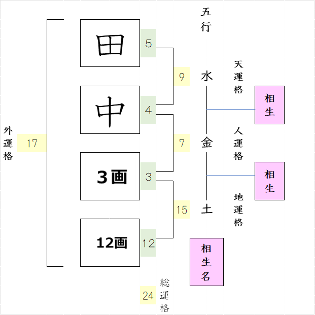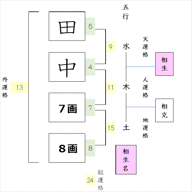 こちらは、人運格と地運格のところが、木‐土で相克になっていますが、水‐木‐土は相生名となっており良い運勢となっています。
