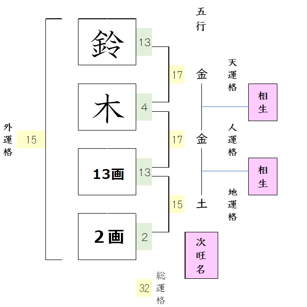 姓名と名前のバランス(配置) 【相生名】となり、天運格、人運格、地運格が相生しており、五行の流れが非常に良い状態で、順調な運勢と言えます。